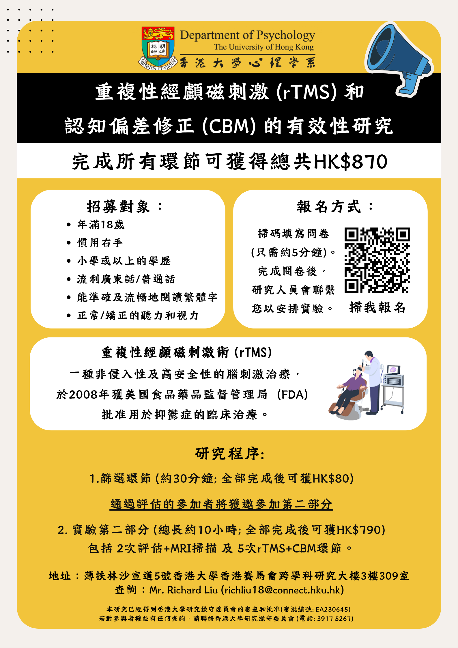 Neuro-cognitive and -affective processes underpin cognitive and affective regulation. Our Lab utilizes social-cognitive-affective principles to understand a range of everyday phenomena. We also investigate processes that have undergone pathological changes leading to cognitive and/or affective dysregulation in clinical populations.